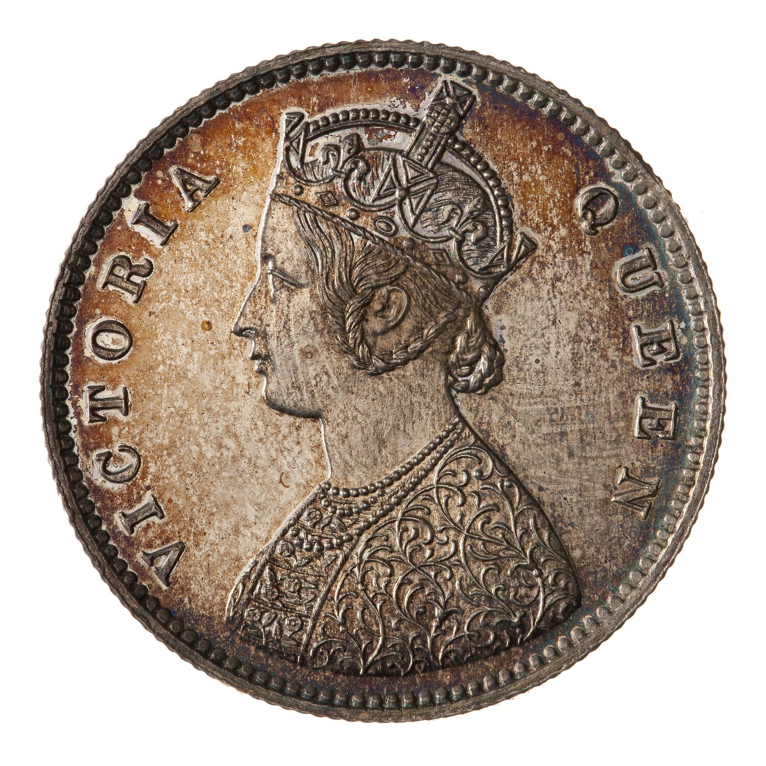 Within entwined scrollwork of Indian flora, HALF / RUPEE / INDIA / 1862