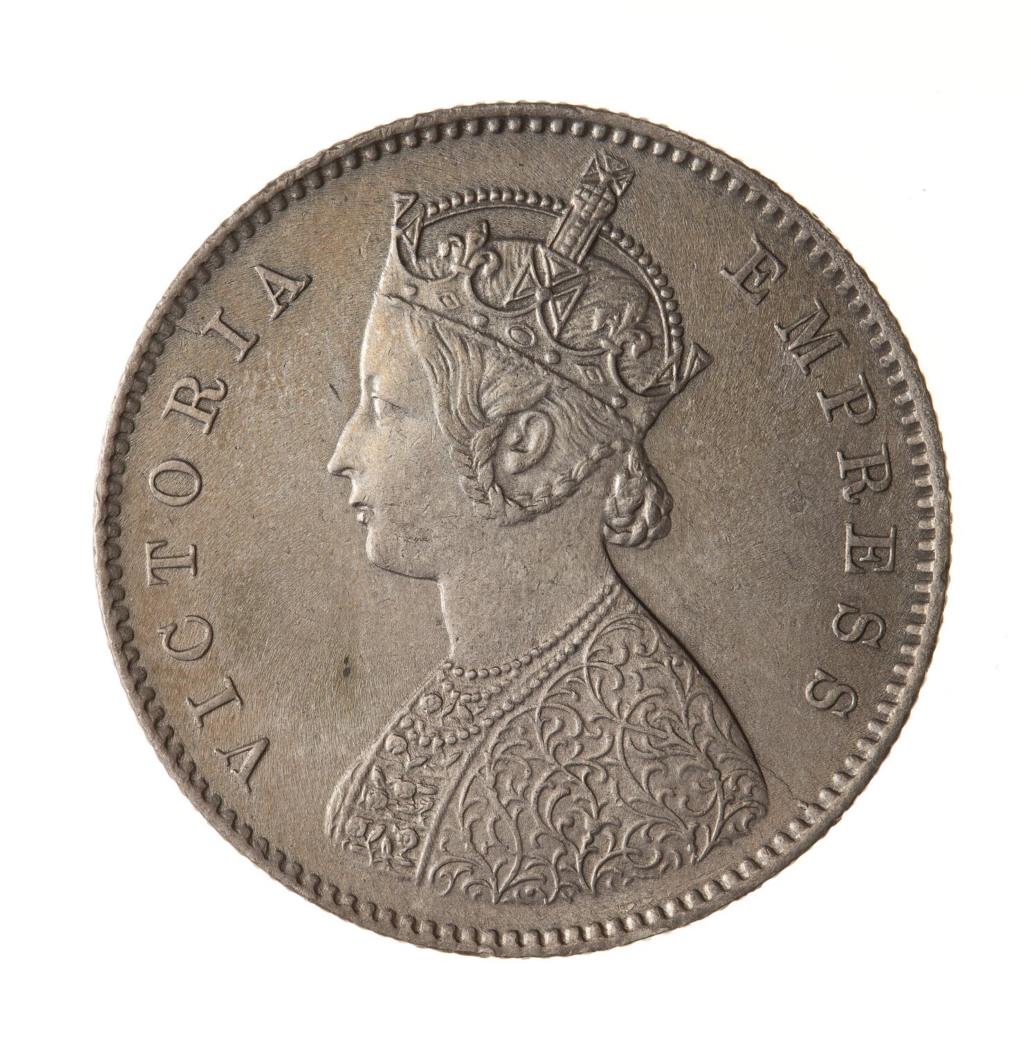 Crowned and robed bust of the queen facing left; around VICTORIA EMPRESS