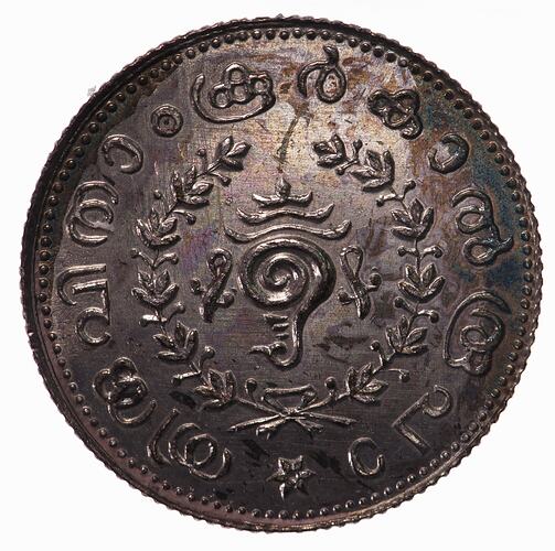 At centre within an open topped wreath, a sankha (conch shell); around above and below a legend in Malayalam characters (Travancore Quarter Rupee)