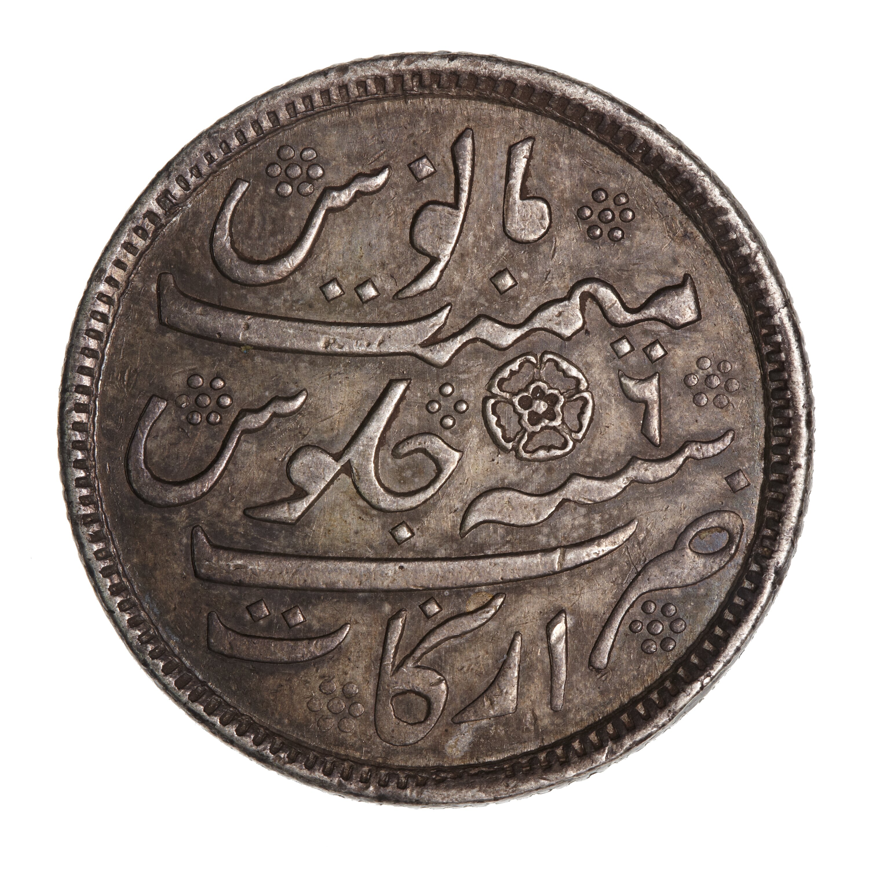 Legend in Persian script (translation: Struck at the Arcot Mint in the 7th year of his tranquil prosperity) with the rose mark Note: the legend and mint name are of a frozen type, they do not name the mint nor give the year of production.