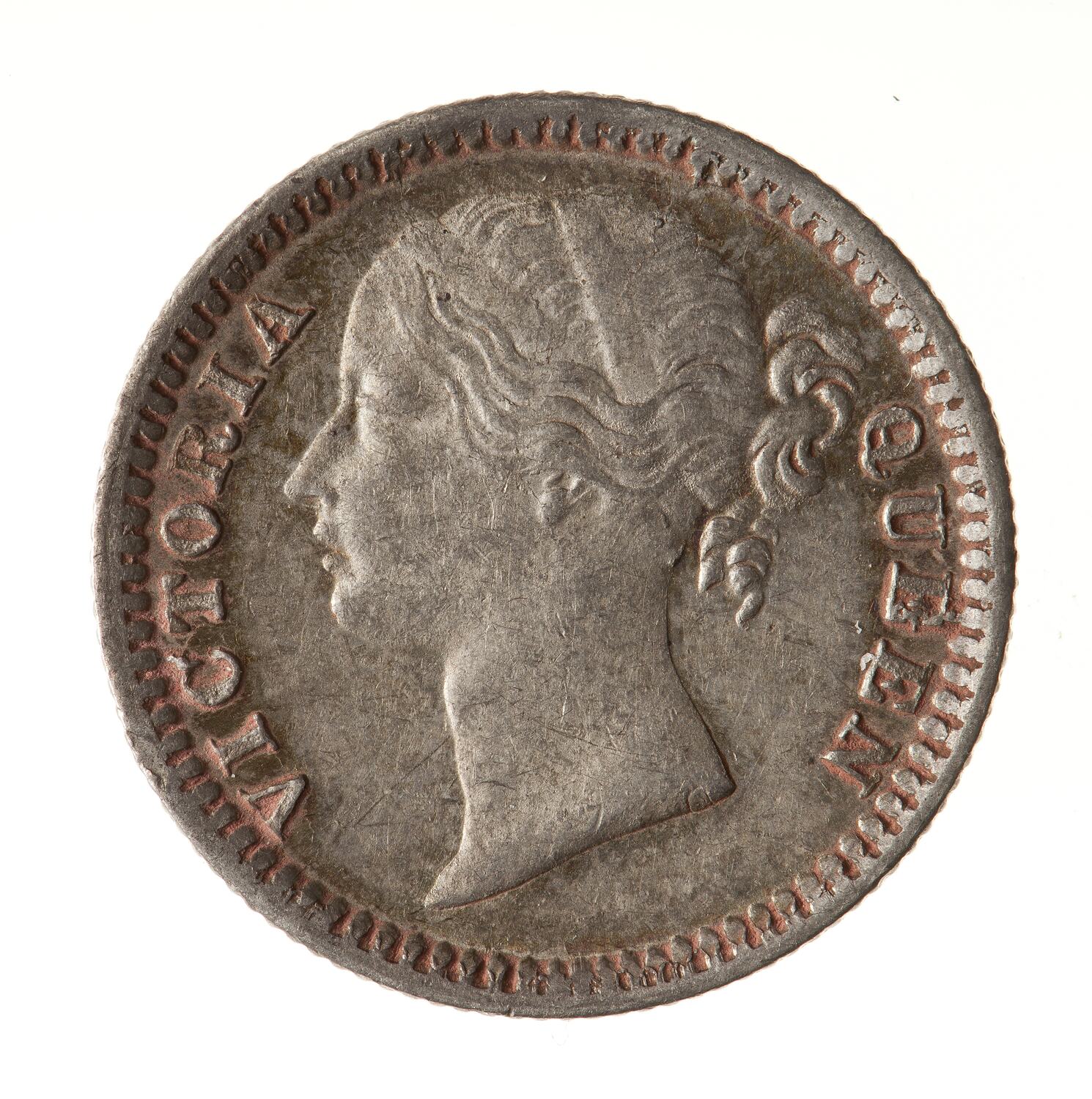 Bare head of the queen facing left; around at sides, 'VICTORIA QUEEN'.