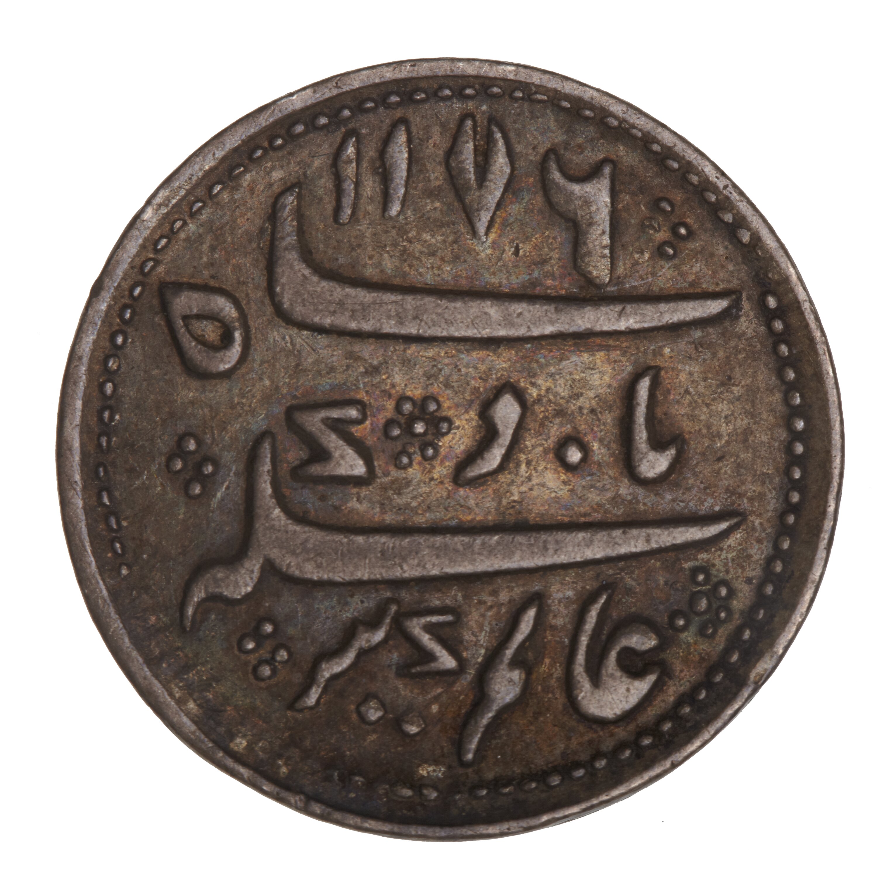 Legend in Persian script (translation: 1172 the coin of the Emperor, Alamgir) Note: the legend and date are of a frozen type, they do not name the issuer nor give the date of production