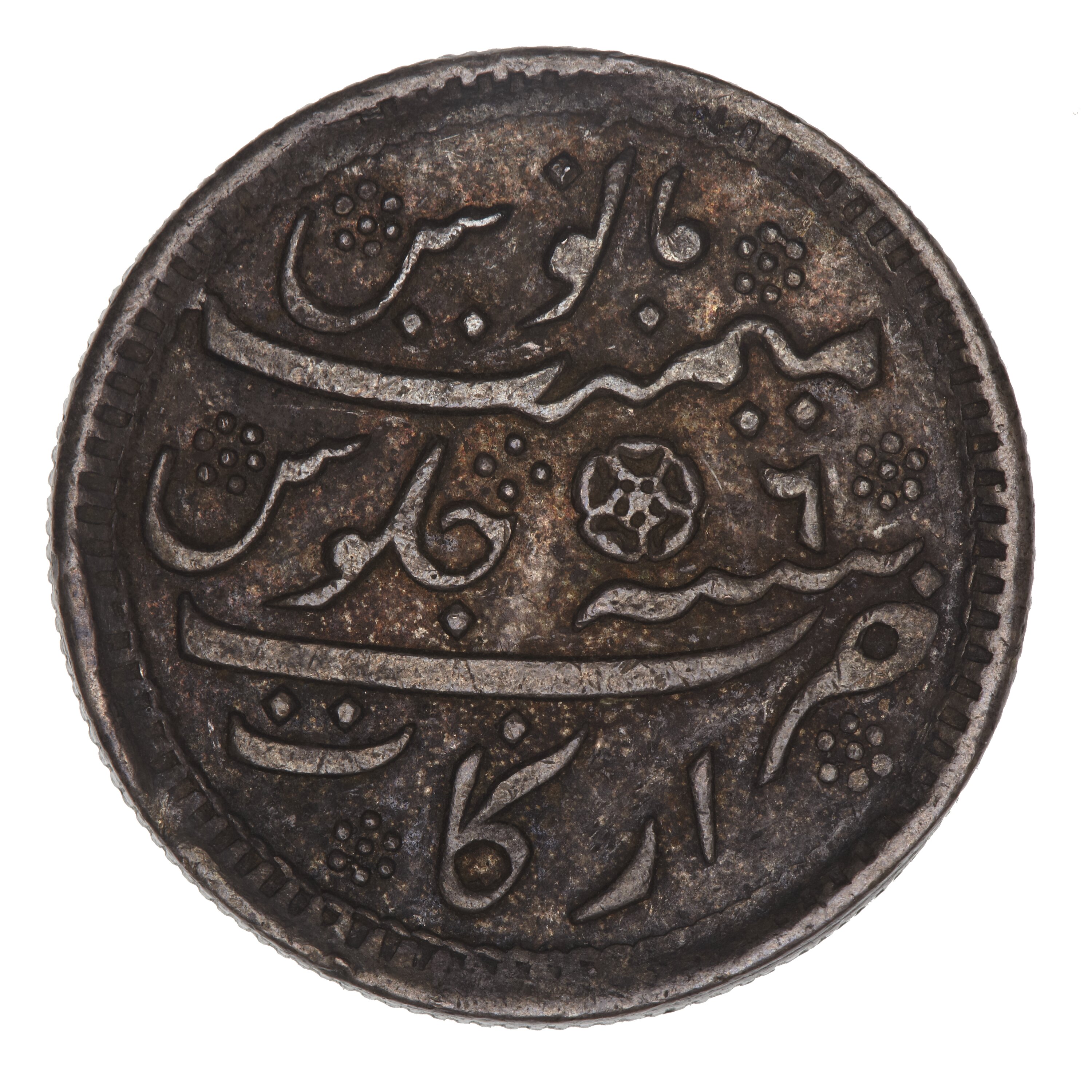 Legend in Persian script (translation: Struck at the Arcot Mint in the 6th year of his tranquil prosperity) with the rose mark Note: the legend and mint name are of a frozen type, they do not name the mint nor give the year of production.