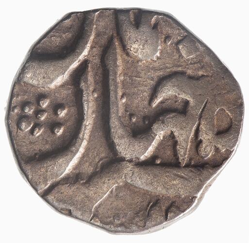 All off flan except two fish with the regnal date 2 between them from the arms of Awadh which was two fish facing one another below a katar surmounted by a crown, tiger supporters with heads turned outwards each holding a pendant; around also off flan, Persian legend