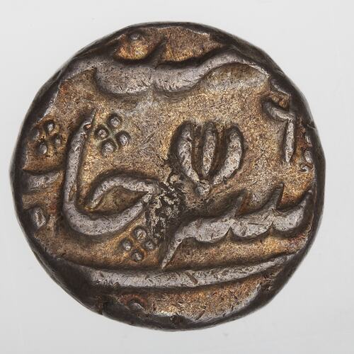 Persian legend, much off flan (translation: The auspicious coin of the Victorious Emperor Chosen of the faith of Muhammad - Alamgir)