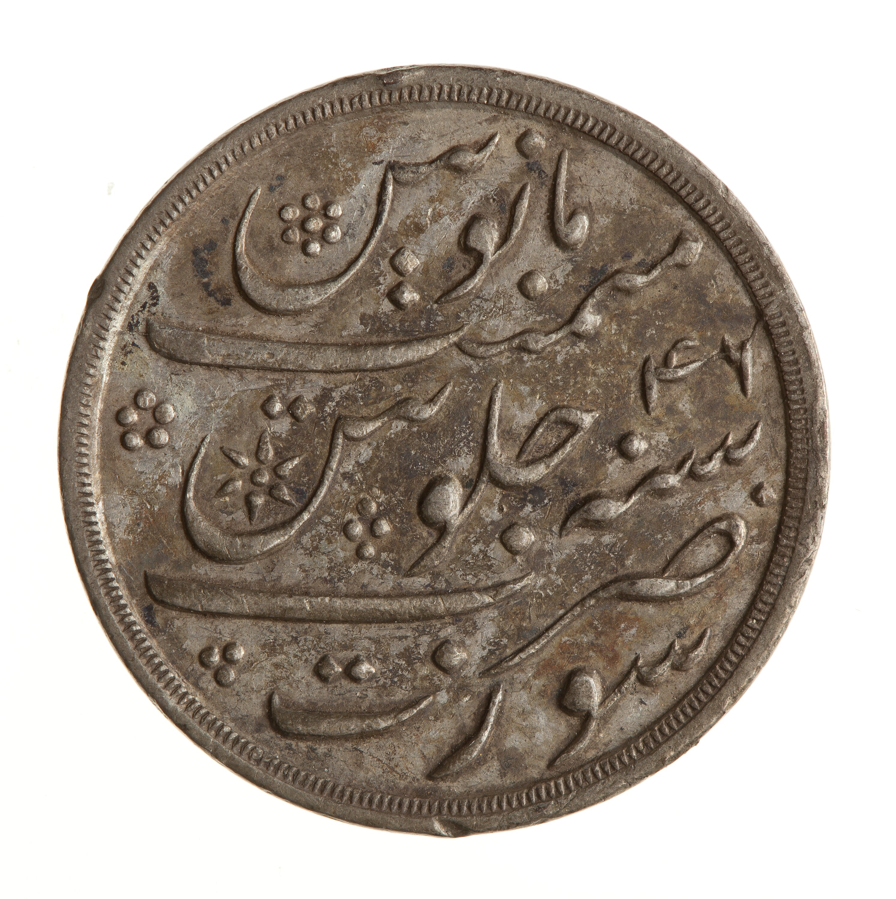Legend in Persian script, (legend translation: The auspicious coin of the Victorious Emperor Shah Alam, 1215)