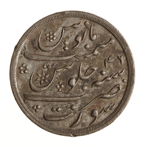 Julus formula legend in Persian script, (legend translation: Struck at Surat in the 46th year of his reign of tranquil prosperity)