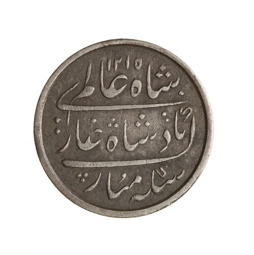 Legend in Persian script, (legend translation: The auspicious coin of the Victorious Emperor Shah Alam, 1215)