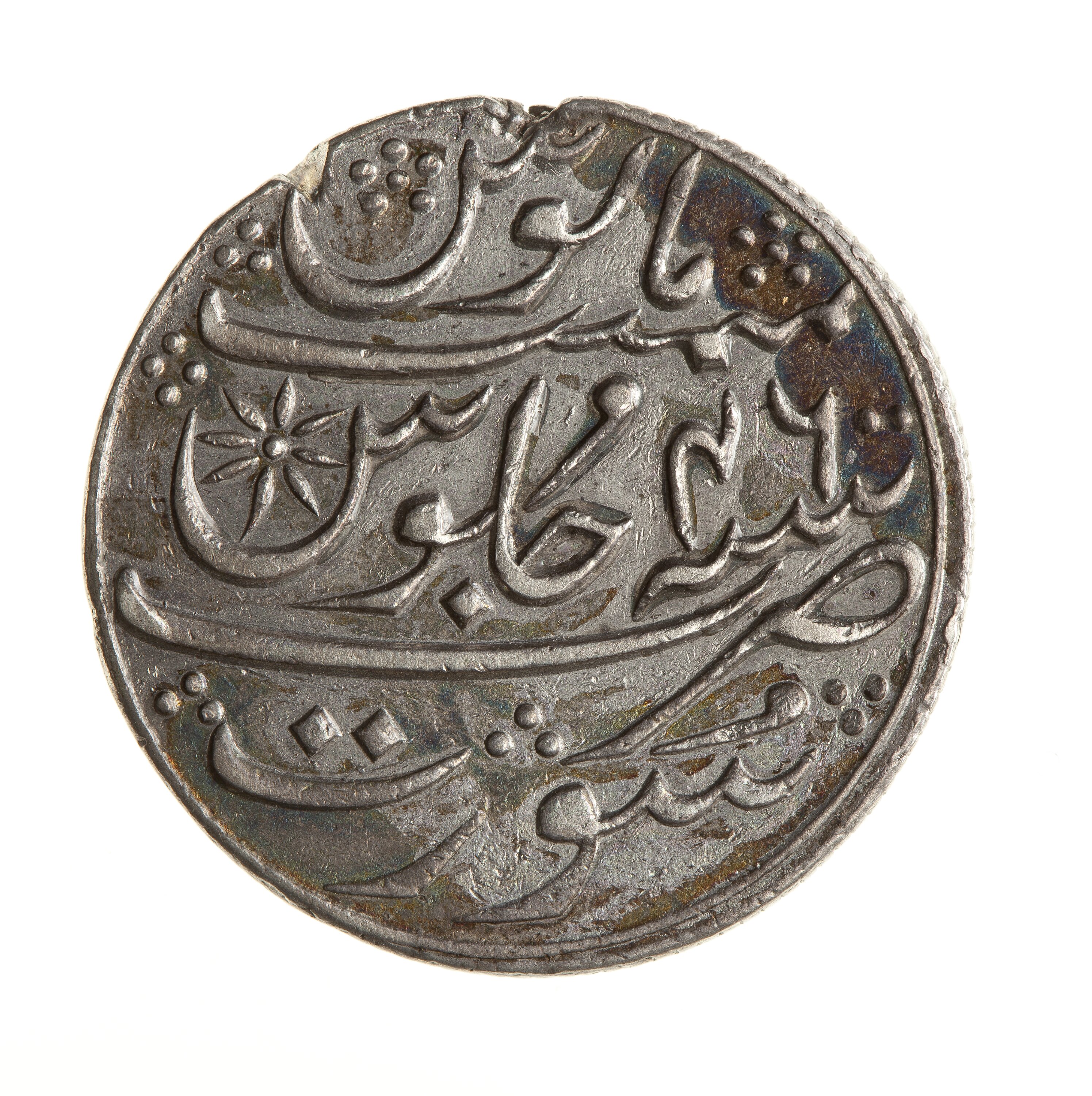 Julus formula legend in Persian script, (legend translation: Struck at Surat in the 46th year of his reign of tranquil prosperity)