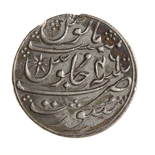 Legend in Persian script, (legend translation: The auspicious coin of the Victorious Emperor Shah Alam, 1215)