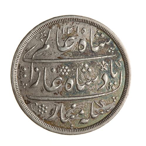 Legend in Persian script, (legend translation: The auspicious coin of the Victorious Emperor Shah Alam, 1215)