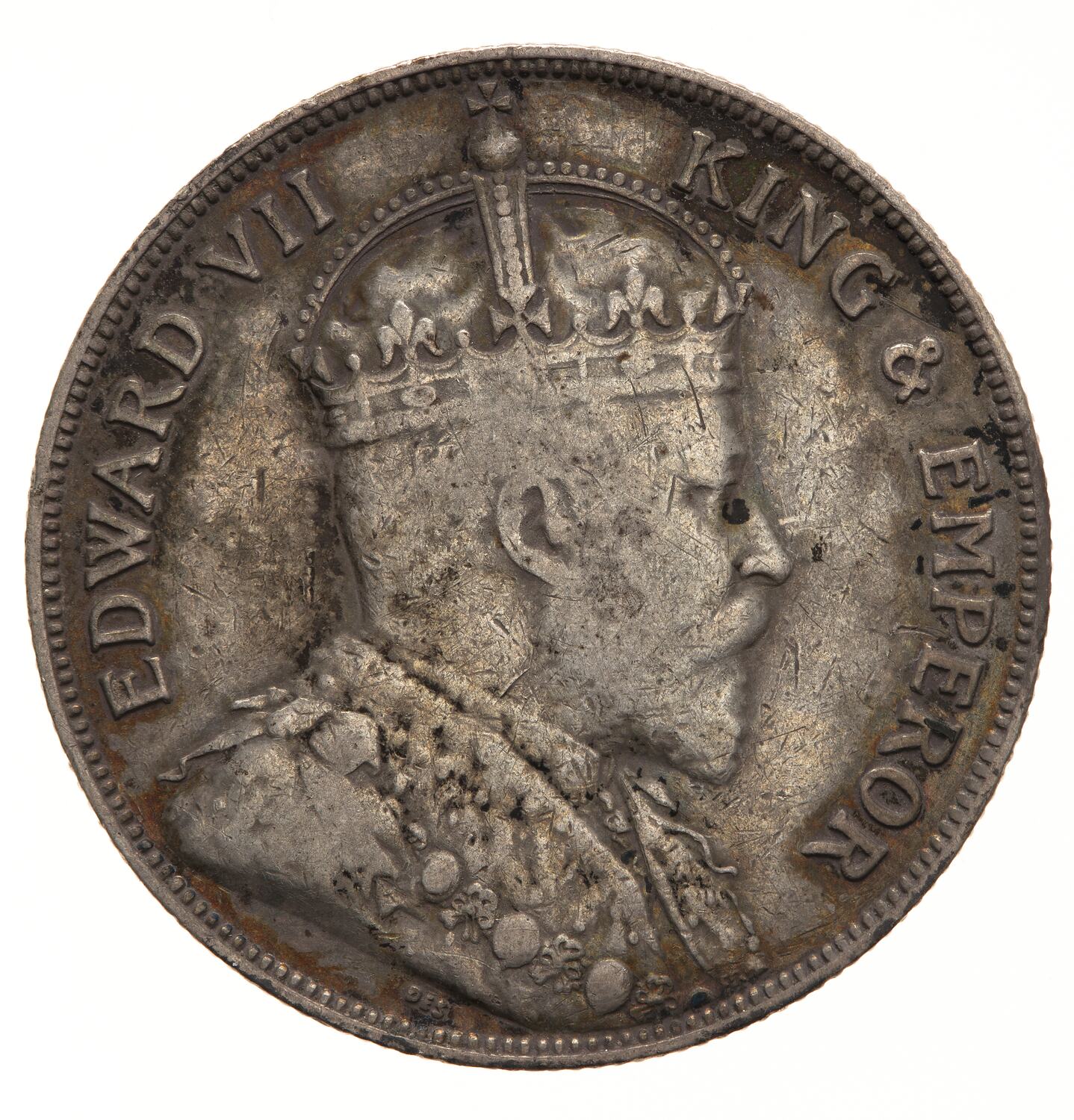 Crowned and draped bust of the King facing right, the King is wearing the Imperial Crown and the ermine Robe of State, the Collar of the Most Honourable Order of the Bath; around, EDWARD VII KING & EMPEROR; below the bust truncation, the artist's initials, DES