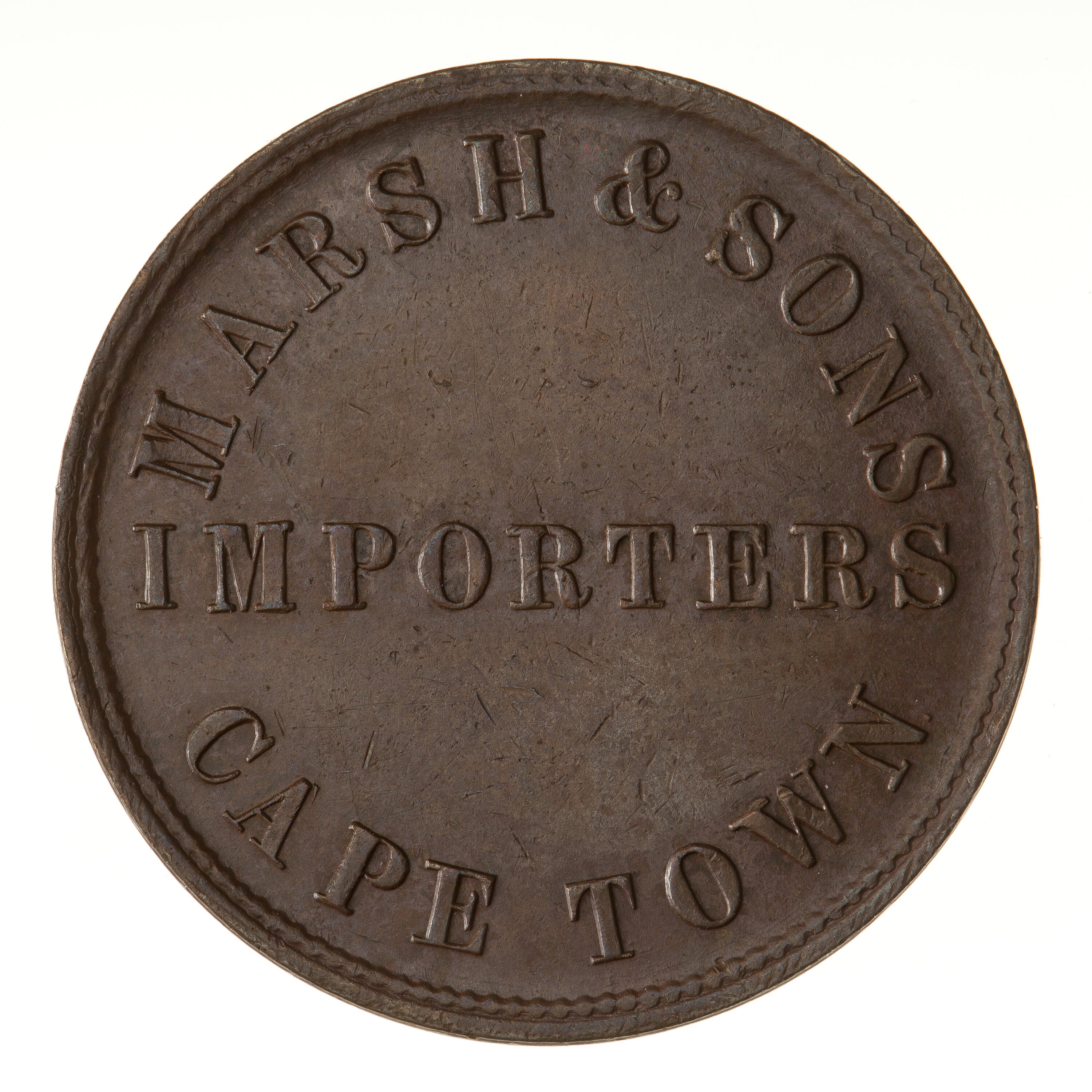 Same reverse die used by H.J. Marsh & Brother, Hobart see NU 4070. Marsh & Sons existed from 1846 until 1921 at 1 Berg Street, Cape Town.