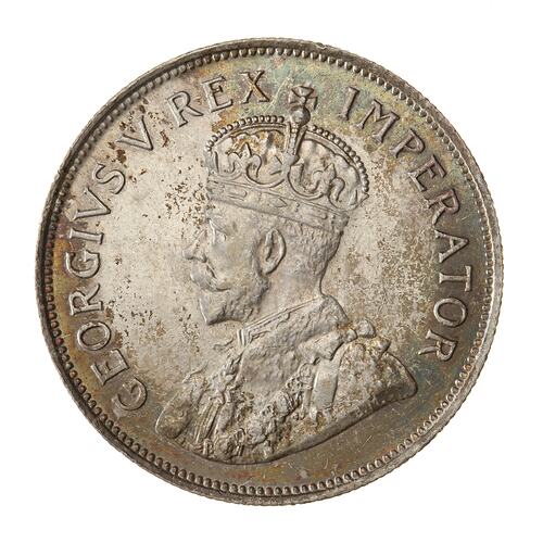 Crowned and draped bust of the King facing left, the King is wearing the Imperial Crown and the ermine Robe of State, the Collar of the Most Noble Order of the Garter, and the Badge of the Most Honourable Order of the Bath; around, GEORGIVS V REX IMPERATOR; on bust truncation, the artist's initials, BM