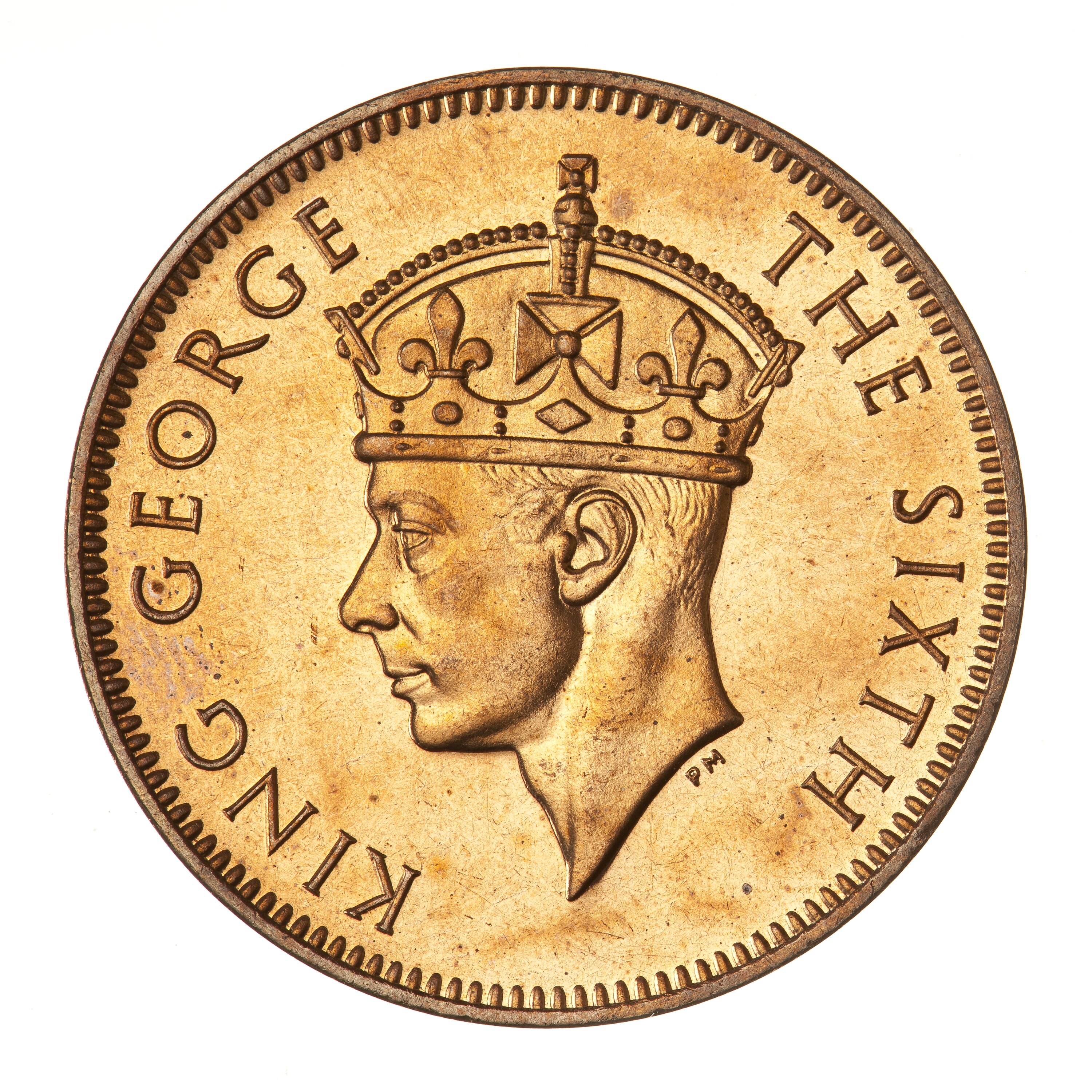 Crowned head of the king facing left; around, KING GEORGE THE SIXTH; the artist's initials, PM, below the neck truncation