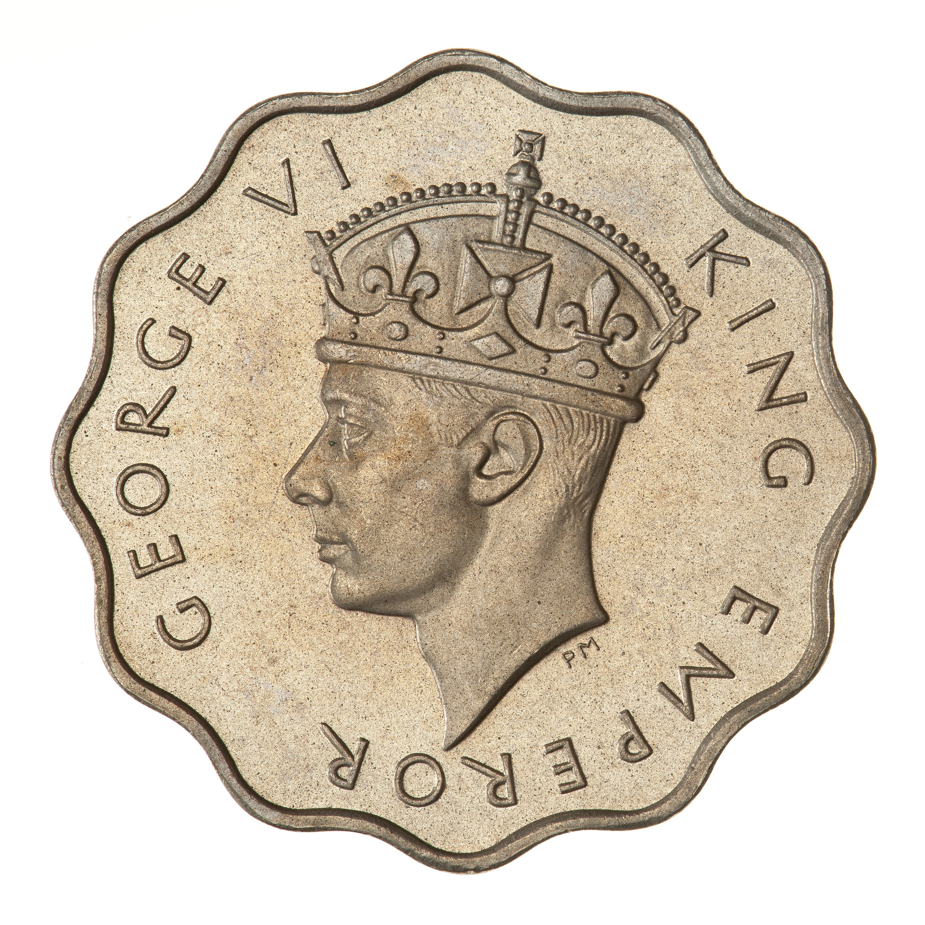 Crowned head of the king facing left; around, GEORGE VI KING EMPEROR; the artist's initials, PM, below the neck truncation