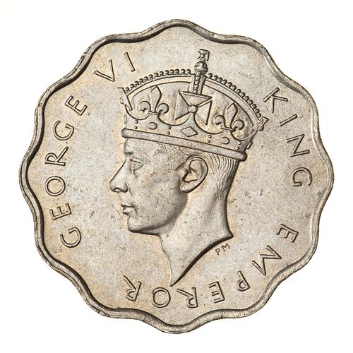 Crowned head of the king facing left; around, GEORGE VI KING EMPEROR; the artist's initials, PM, below the neck truncation