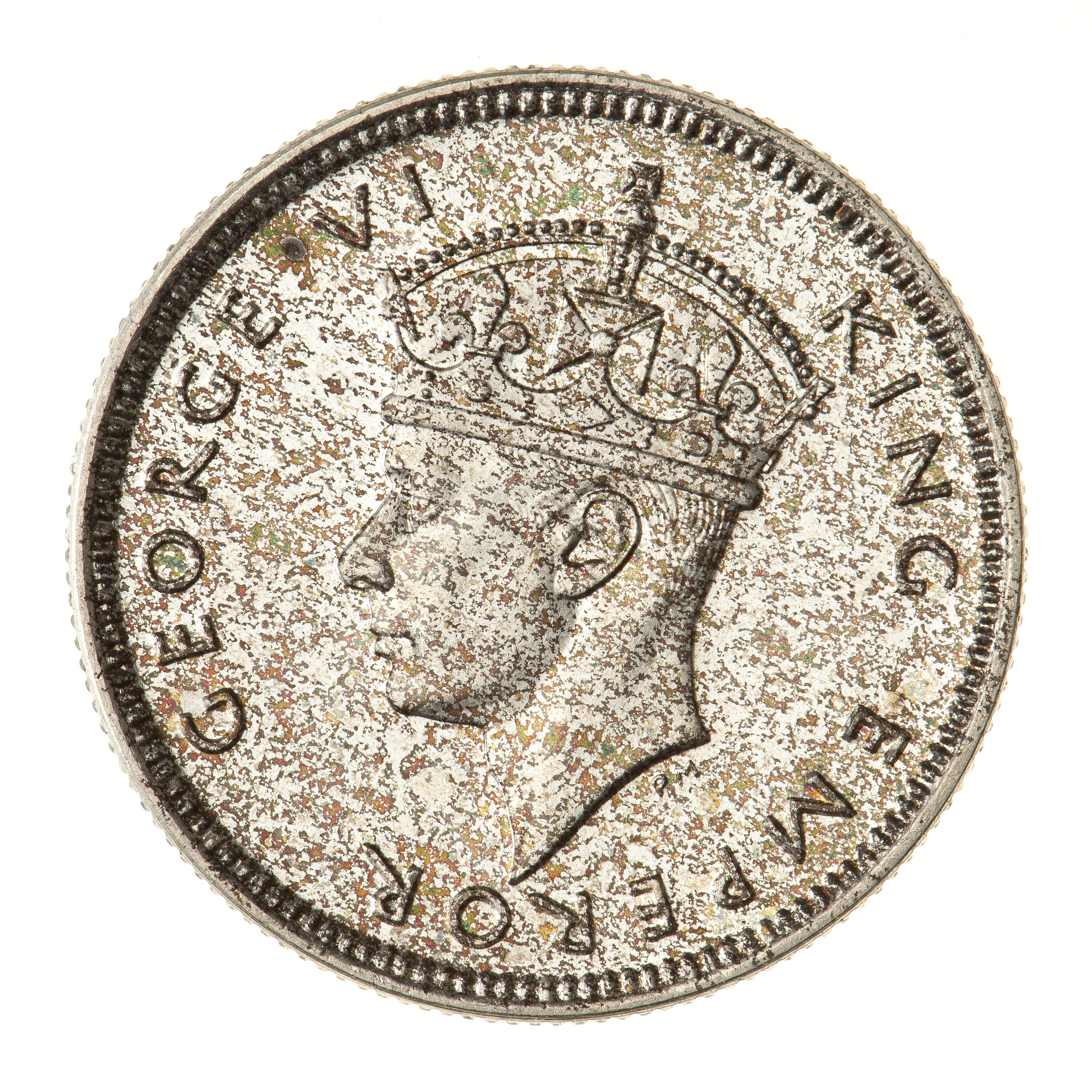 Crowned head of the king facing left; around, GEORGE VI KING EMPEROR; the artist's initials, PM, below the neck truncation