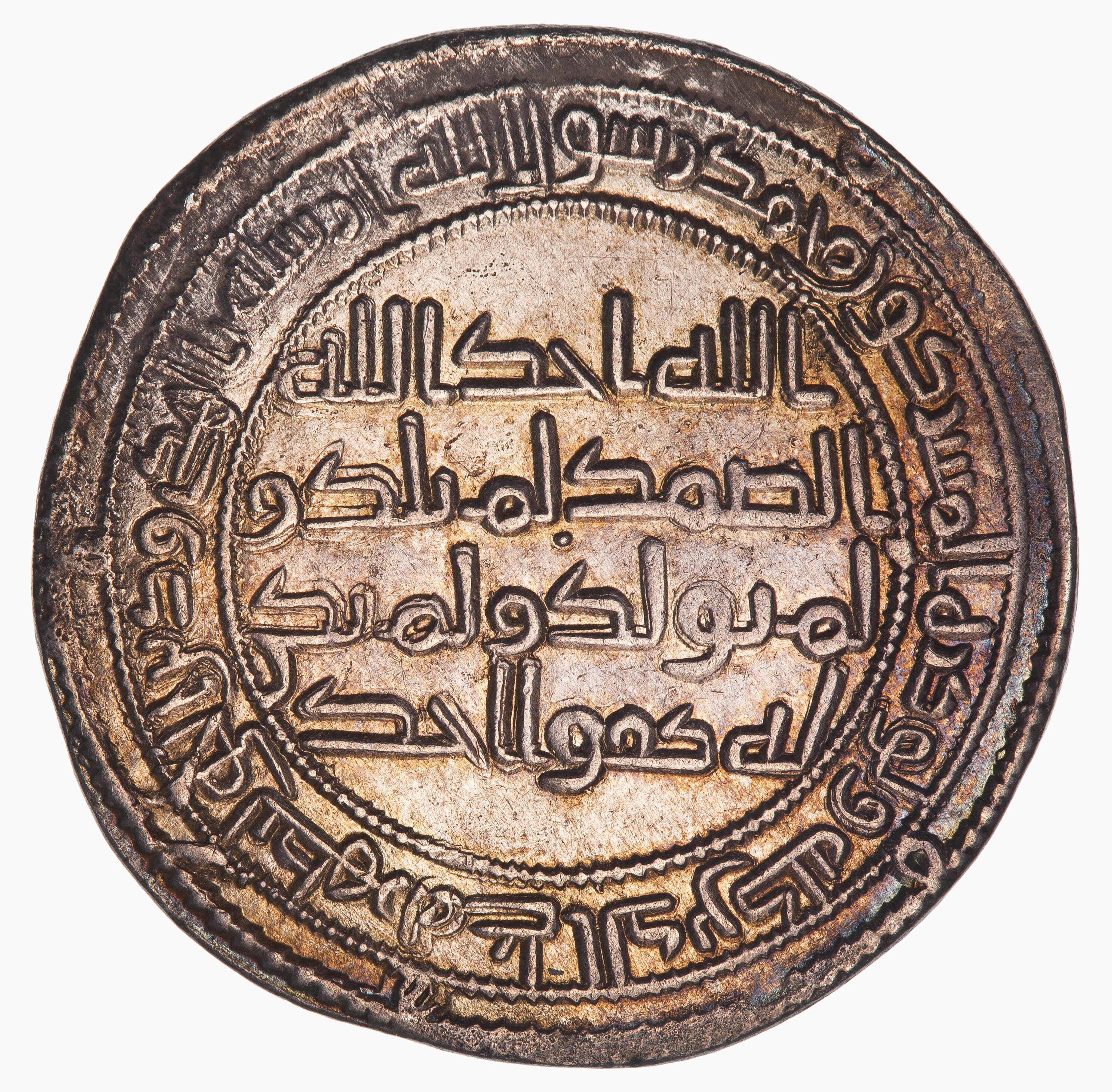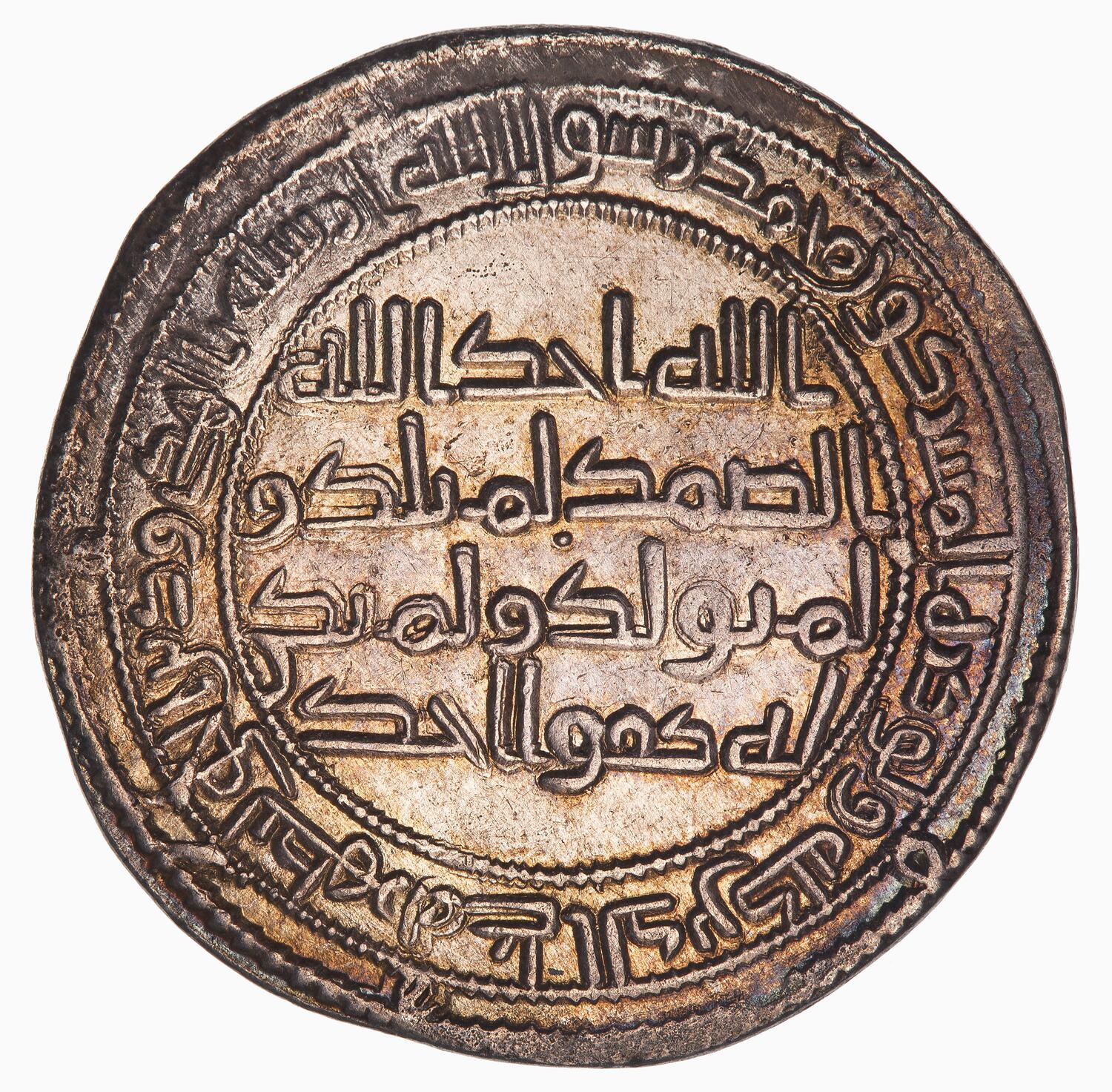 At centre Arabic legend in three lines (translation: 'There is no deity except God alone He has no equal'); around Arabic legend (translation: 'In the name of God. This Dirham was struck in Wasit in the year three and ninety').