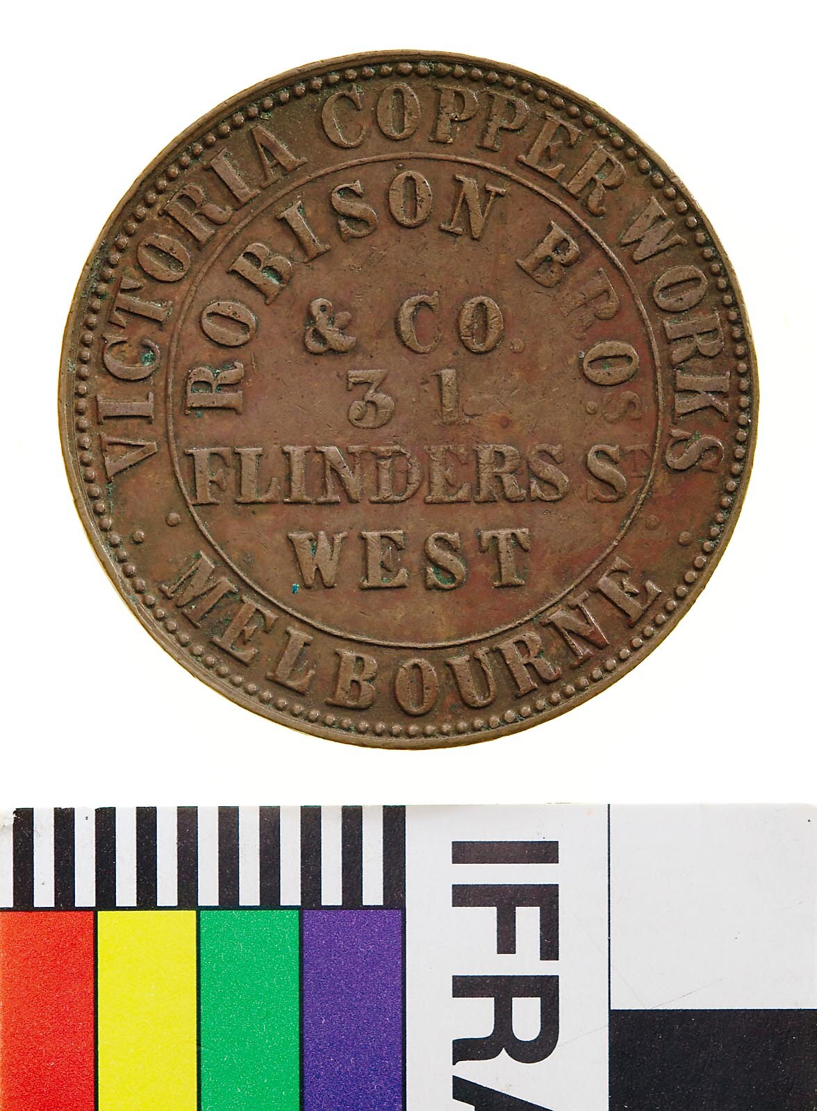 At centre within line circle, ROBISON BROS. / & CO. / 31 / FLINDERS ST / WEST; around, VICTORIA COPPER WORKS : MELBOURNE : (Sharples' obverse C). The DE of FLINDERS is weakly struck.