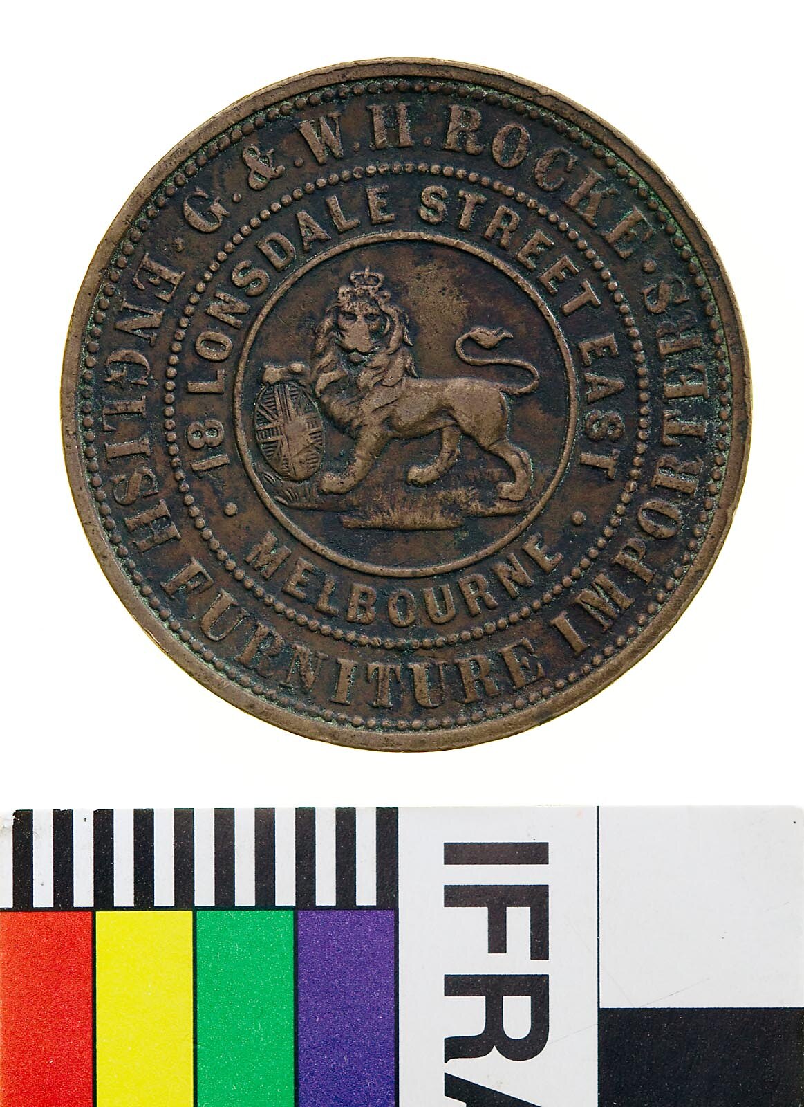 Obverse: G.&.W.H.ROCKE ENGLISH FURNITURE IMPORTERS 18 LONSDALE STREET EAST MELBOURNE Reverse: MELBOURNE VICTORIA 1859