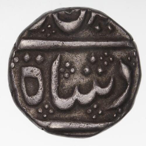 Minted by After the death of Emperor Alamgir II in 1759 , the regnal year 6 bacame frozen and this type of rupee was struck at the Company's mints at Madras, Calcutta, Murshidabad and Dacca - without distinguishing marks and with most of the legends off the flan. Production continued until 1807.