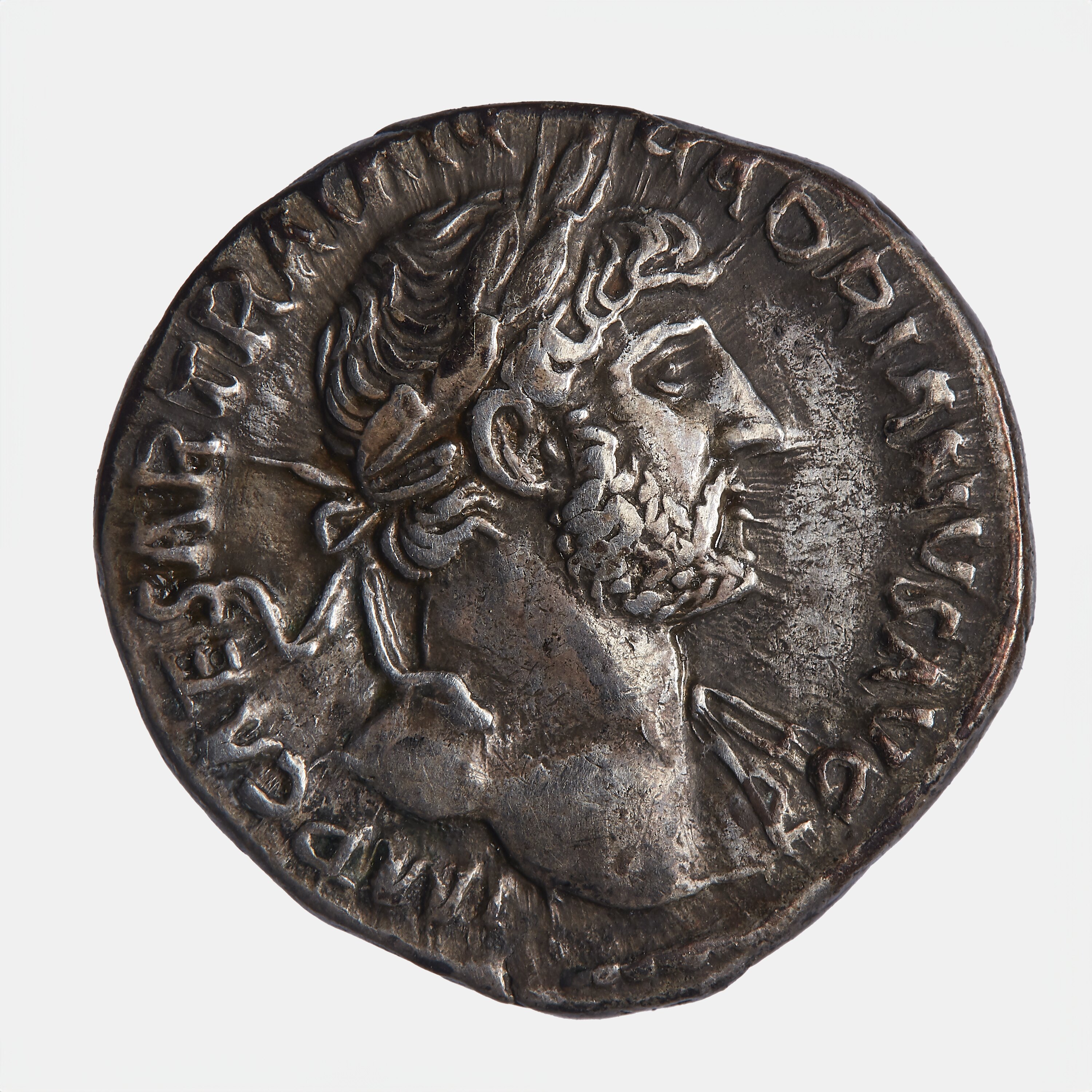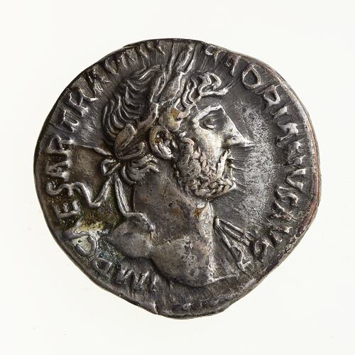 Laureate bust of Hadrian facing right, drapery on left shoulder; around, IMP CAESAR TRAIAN HADRIANVS AVG