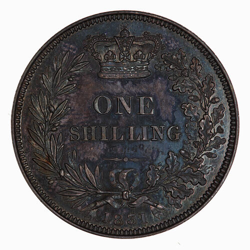 In three lines, within a wreath of oak (right) and olive (left) surmounted by a crown, ONE SHILLING 1831