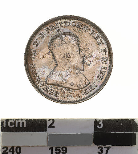 A silver coin (19 mm diameter with milled edge) featuring a crowned and robed bust of Edward VII facing right; around, EDWARDVS VII D:G: BRITT: OMN: REX F: D: IND: IMP: ; below bust in small lettering the artist's initials DES. The reverse features the Ensigns Armorial of the Commonwealth of Australia, as authorised by Royal Warrent 7th May 1908 - composed of a simple shield enclosing a cross of Saint George on which are five six-pointed stars, around the outside of which are six small escutcheons, i.e., small shields. The shield is supported by a kangaroo and an emu standing on a grassy mound. Above the shield a crest, the seven-pointed star of Federation on a wreath. Below on a ribbon the motto ADVANCE AUSTRALIA is inscribed. Around above, SIXPENCE and below, between arrow heads, the date, 1910.