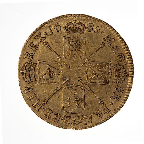 Four crowned shields, bearing the arms of England Scotland France and Ireland, arranged to form a cross; in the angles four septres surmounted by and orb, thistle, harp and lis; around, MAG . BR . FRA . ET . HIB REX 1685, the date being divided by the crown above the English shield.