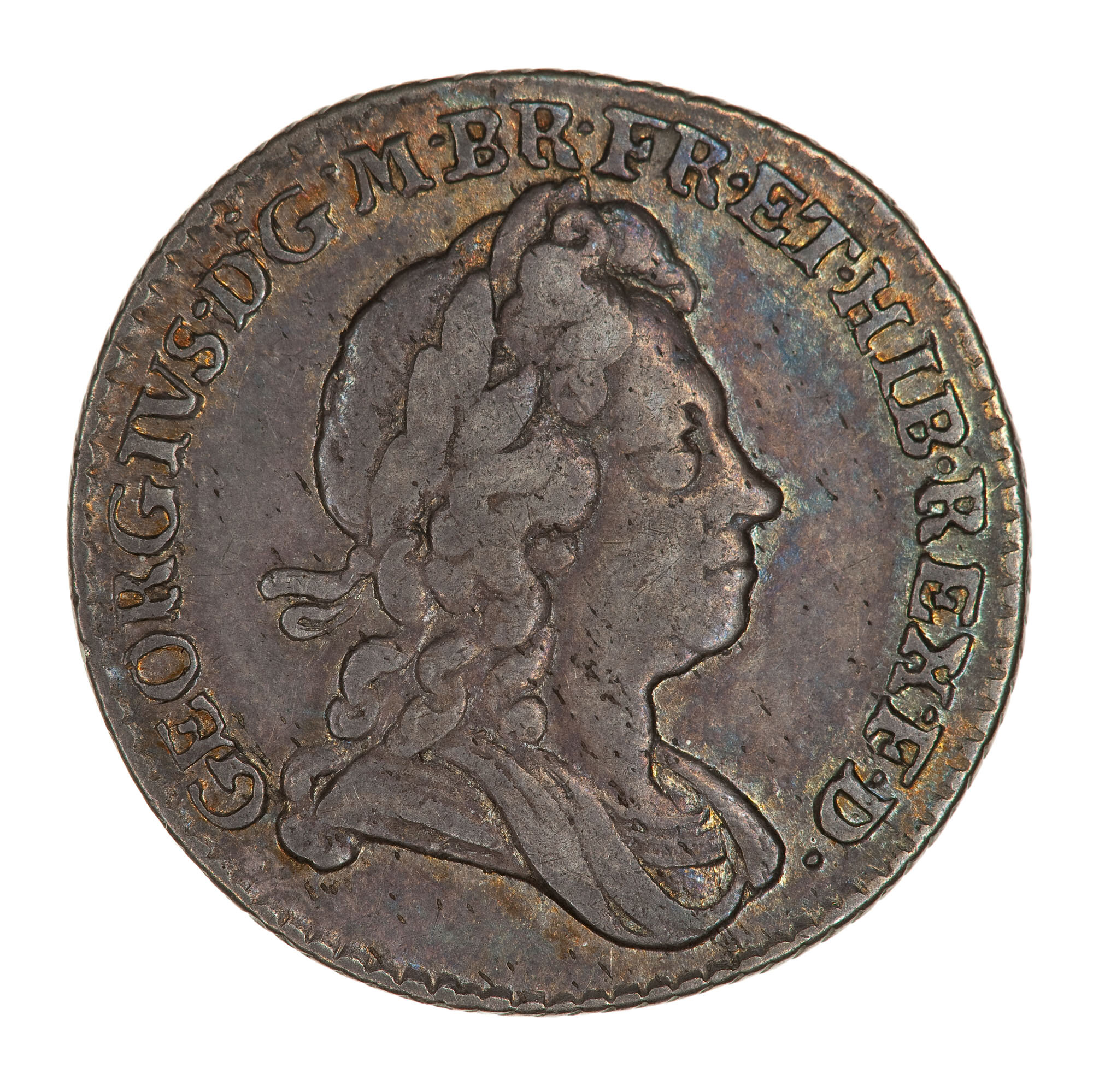 Laureate and draped bust of George I facing right; around, GEORGIVS D G M BR FR ET HIB REX F D (translation: George I by the Grace of God King of Great Britain, France and Ireland, Defender of the Faith).