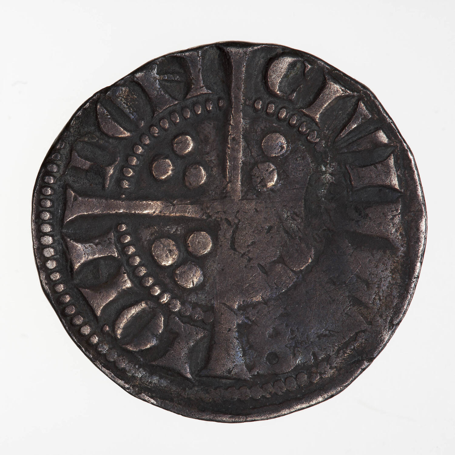 A long cross with three beads in the angles; around outside a circle of beads, CIVI TAS LON DON