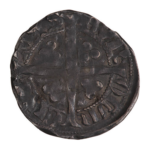 The obverse has been tooled to show a face so the class of the coin can no longer be determined, it features a crowned bust of the King facing; around, + EDWAR R ANGL DNS HYB