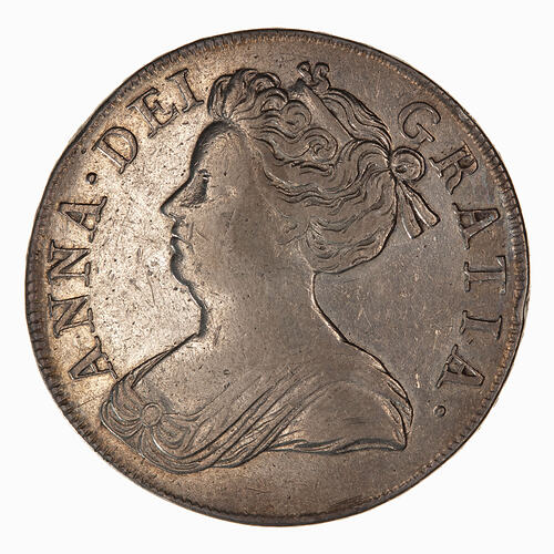 Draped bust of Anne, left; around, ANNA DEI GRATIA