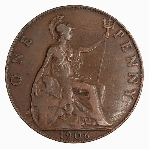 Britannia seated facing right on a rock wearing a helmet and flowing robes; she holds a trident and rests her right hand on a shield which bears the combined crosses of the Union Flag; around, ONE PENNY; in exergue, 1906