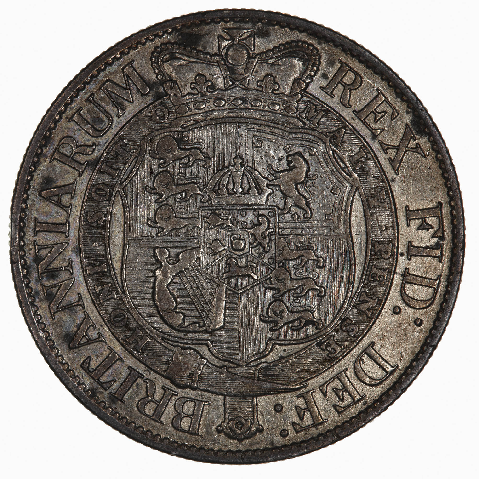 Crowned shield bearing Royal arms within the Garter with motto, HONI SOIT QUI MAL Y PENSE; around, BRITANNIARUM REX FID: DEF: