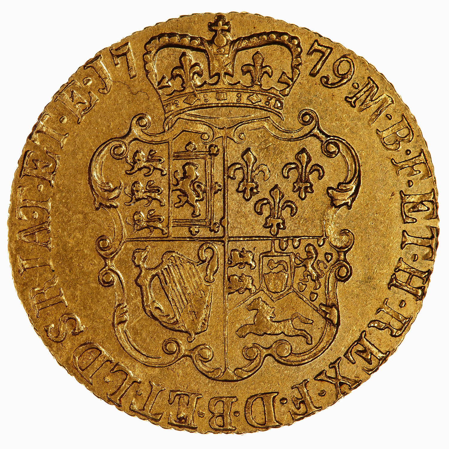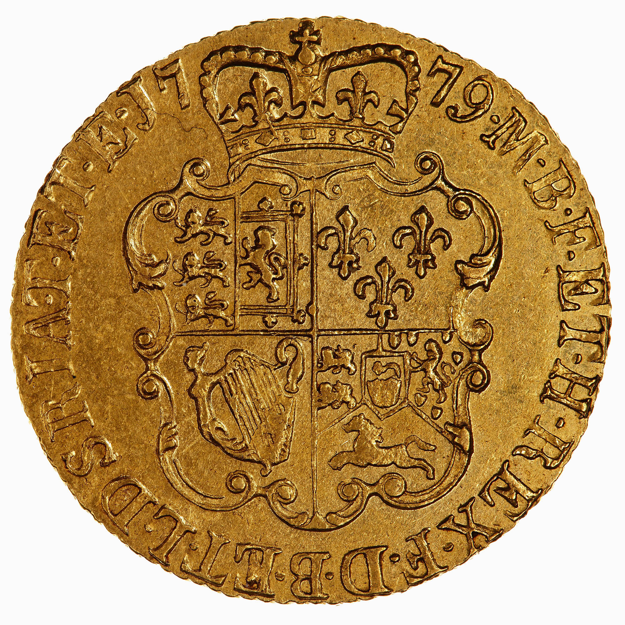 Crowned and garnished shield quartered with the arms of England and Scotland impaled, France, Ireland and the Electorate of Brunswick and Luneburg; around, M B F ET H REX F D B ET L D S R I A T ET E 1779, the date being divided by the crown. (translation fro obverse to reverse, George III by the Grace of God King of Great Britain, France and Ireland, Duke of Brunswick and Luneberg, Archi-Thesaurius and Elector of the Holy Roman Empire).