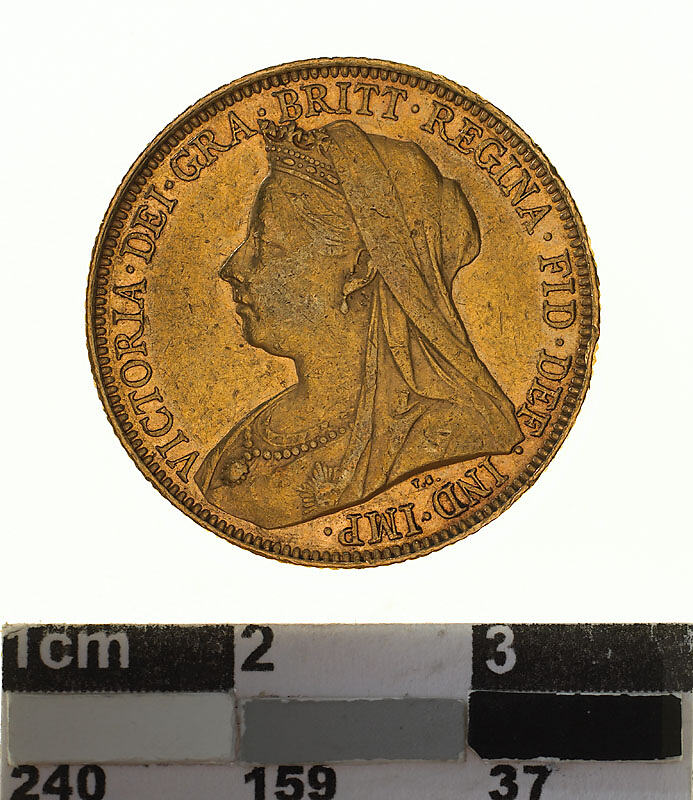 A gold coin (21.5 mm diameter with milled edge) featuring a crowned bust of Queen Victoria facing left, veiled and draped, wearing ribbon and Star of Garter; around VICTORIA . DEI . GRA . BRITT. REGINA . FID . DEF . IND . IMP . , the artist's initials, T.B. are below the bust. The reverse features St. George on horseback holding short sword in right hand, wearing a flowing cape, helmet and boots; the horse rearing to right over a fallen dragon which has a broken lance in its chest; the date, 1901 in the exergue. The mint mark S is in the ground above the middle of the date.