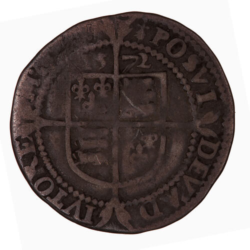 At centre within a beaded circle and over a long cross fourchee, a plain square topped shield quartered with the arms of France (1 & 4) and England (2 & 3); above, 1572; around, (mm. ermine) POSVI DEV ADIVTOREM MEV (translation, I have made God my helper)