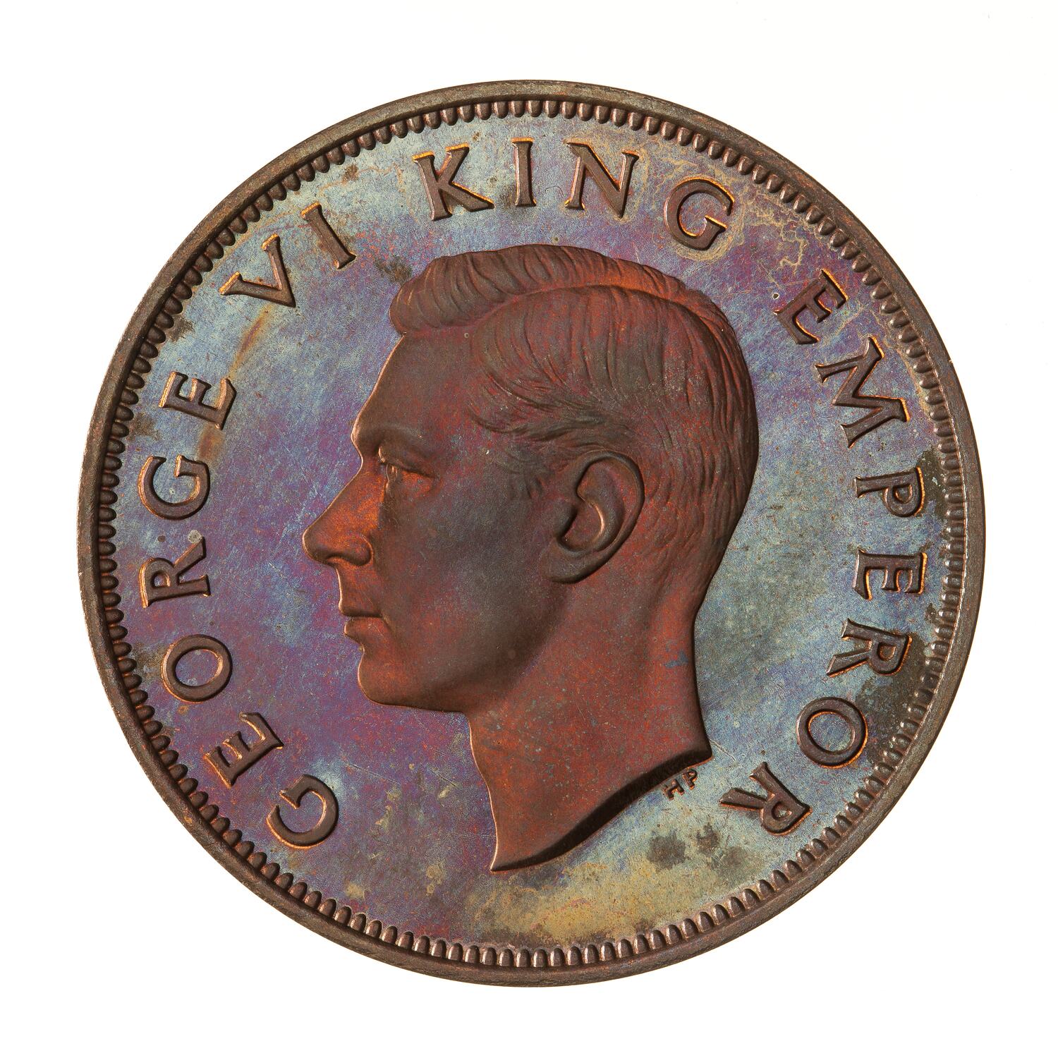 Bare head of the king facing left; around, GEORGE VI KING EMPEROR; below neck in small letters the artist's initials, HP (Humphrey Paget)