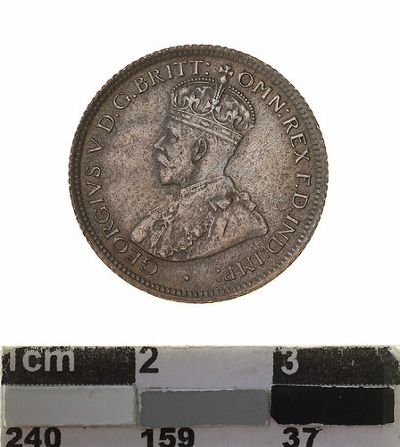 A silver coin (19 mm diameter with milled edge) featuring a crowned and robed bust of George V facing left; around, GEORGIVS V D.G. BRITT: OMN: REX F.D. IND: IMP: ; below bust in small lettering the artist's initials B.M.. The reverse features the Ensigns Armorial of the Commonwealth of Australia, as authorised by Royal Warrent 7th May 1908 - composed of a simple shield enclosing a cross of Saint George on which are five six-pointed stars, around the outside of which are six small escutcheons, i.e., small shields. The shield is supported by a kangaroo and an emu standing on a grassy mound. Above the shield a crest, the seven-pointed star of Federation on a wreath. Below on a ribbon the motto ADVANCE AUSTRALIA is inscribed. Around above, SIXPENCE and below, between arrow heads, the date, 1914.