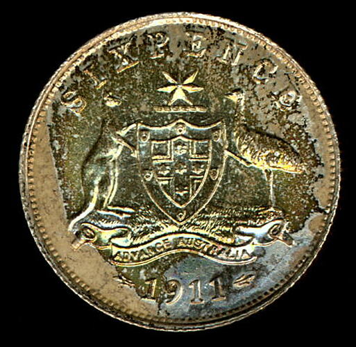 A silver coin (19 mm diameter with milled edge) featuring a crowned and robed bust of George V facing left; around, GEORGIVS V D.G. BRITT: OMN: REX F.D. IND: IMP: ; below bust in small lettering the artist's initials B.M.. The reverse features the Ensigns Armorial of the Commonwealth of Australia, as authorised by Royal Warrent 7th May 1908 - composed of a simple shield enclosing a cross of Saint George on which are five six-pointed stars, around the outside of which are six small escutcheons, i.e., small shields. The shield is supported by a kangaroo and an emu standing on a grassy mound. Above the shield a crest, the seven-pointed star of Federation on a wreath. Below on a ribbon the motto ADVANCE AUSTRALIA is inscribed. Around above, SIXPENCE and below, between arrow heads, the date, 1911.
