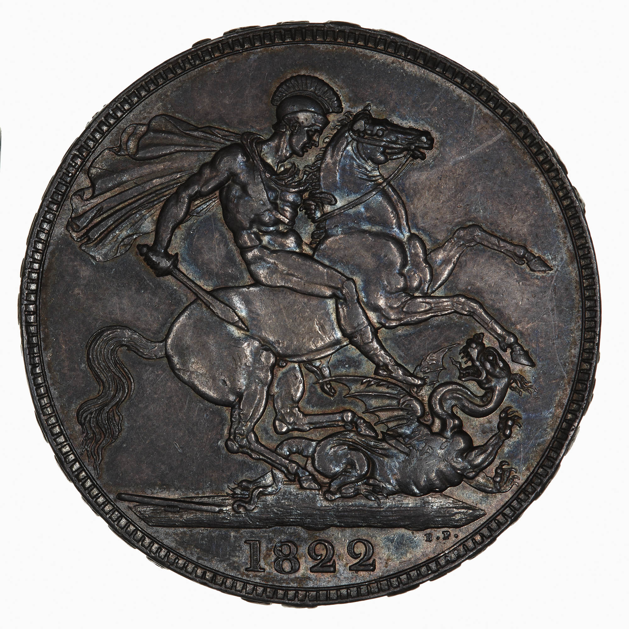St. George, wearing a helmet and cape and holding a sword, on horseback attacking to right, below the front of the horse a fallen dragon; in small letters at right side of exergue line the artist's initials, B.P. (Benedetto Pistrucci); in exergue, 1822