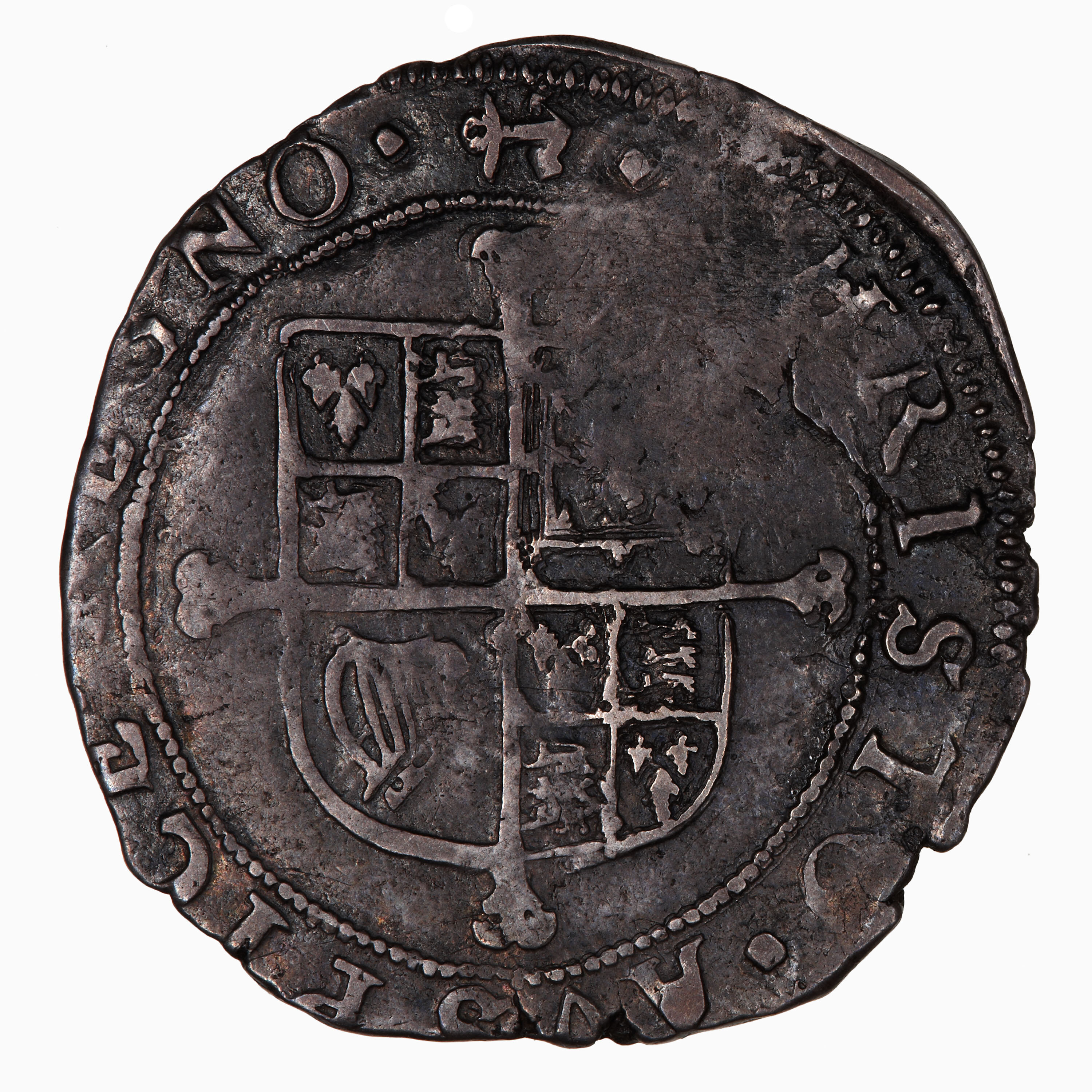 Square-topped shield quartered with combined arms of England and France (1st and 4th), Scotland and Ireland over cross moline; around, CHRISTO AVSPICE REGNO (mm. anchor) (translation: I reign under the auspices of Christ)