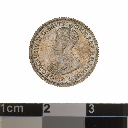 Obverse: GEORGIVS V D. G. BRITT: OMN: REX F. D. IND: IMP: Reverse: THREEPENCE 1911 ADVANCE AUSTRALIA