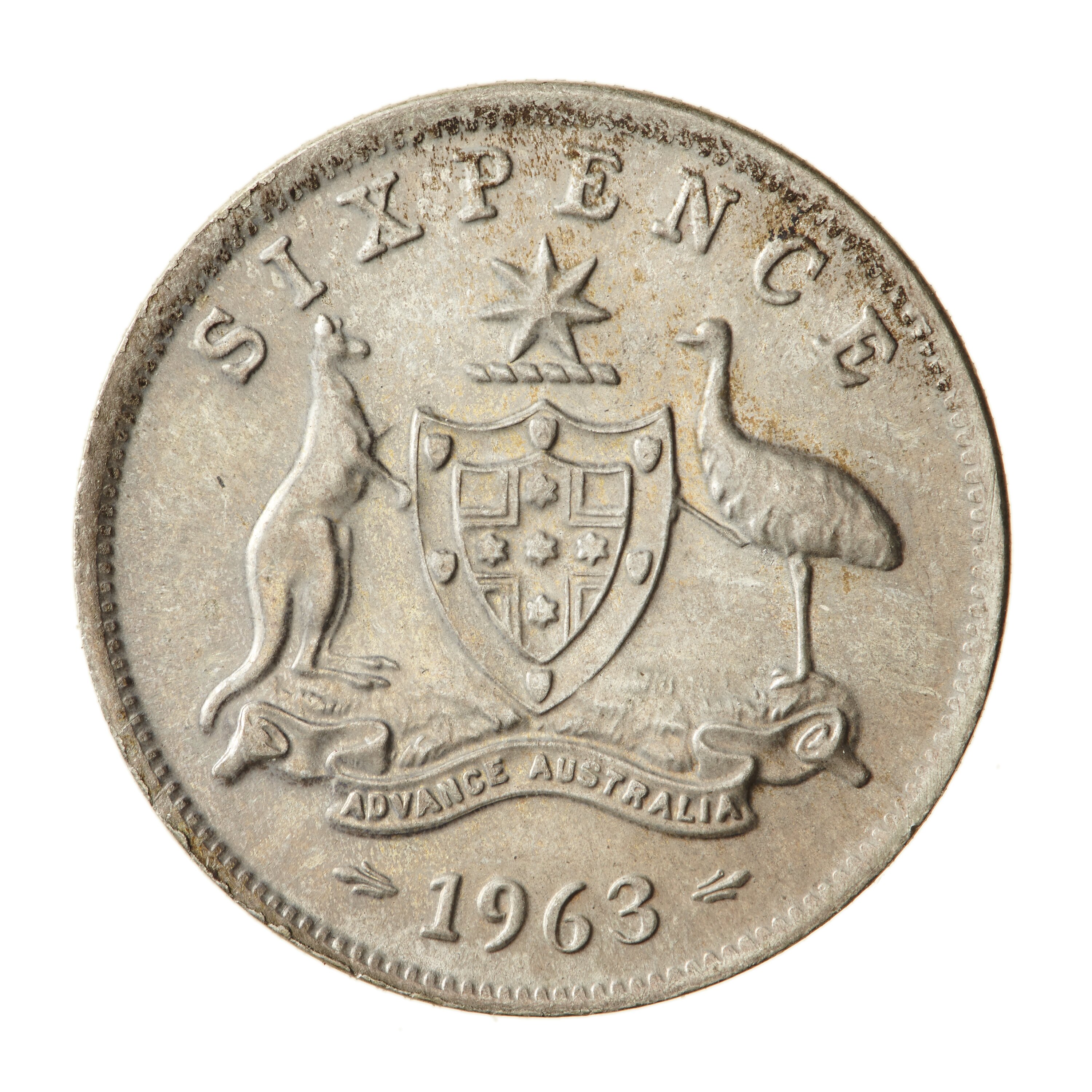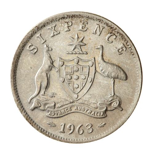 A silver coin (19 mm diameter with milled edge) featuring a laureate head of Elizabeth II facing right; around, + ELIZABETH . II . DEI . GRATIA . REGINA . F: D:. The artist's initials M.G. incuse on the bust truncation above the G of GRATIA. The reverse features the Ensigns Armorial of the Commonwealth of Australia, as authorised by Royal Warrent 7th May 1908 - composed of a simple shield enclosing a cross of Saint George on which are five six-pointed stars, around the outside of which are six small escutcheons, i.e., small shields. The shield is supported by a kangaroo and an emu standing on a grassy mound. Above the shield a crest, the seven-pointed star of Federation on a wreath. Below on a ribbon the motto ADVANCE AUSTRALIA is inscribed. Around above, SIXPENCE and below, between arrow heads, the date, 1963.