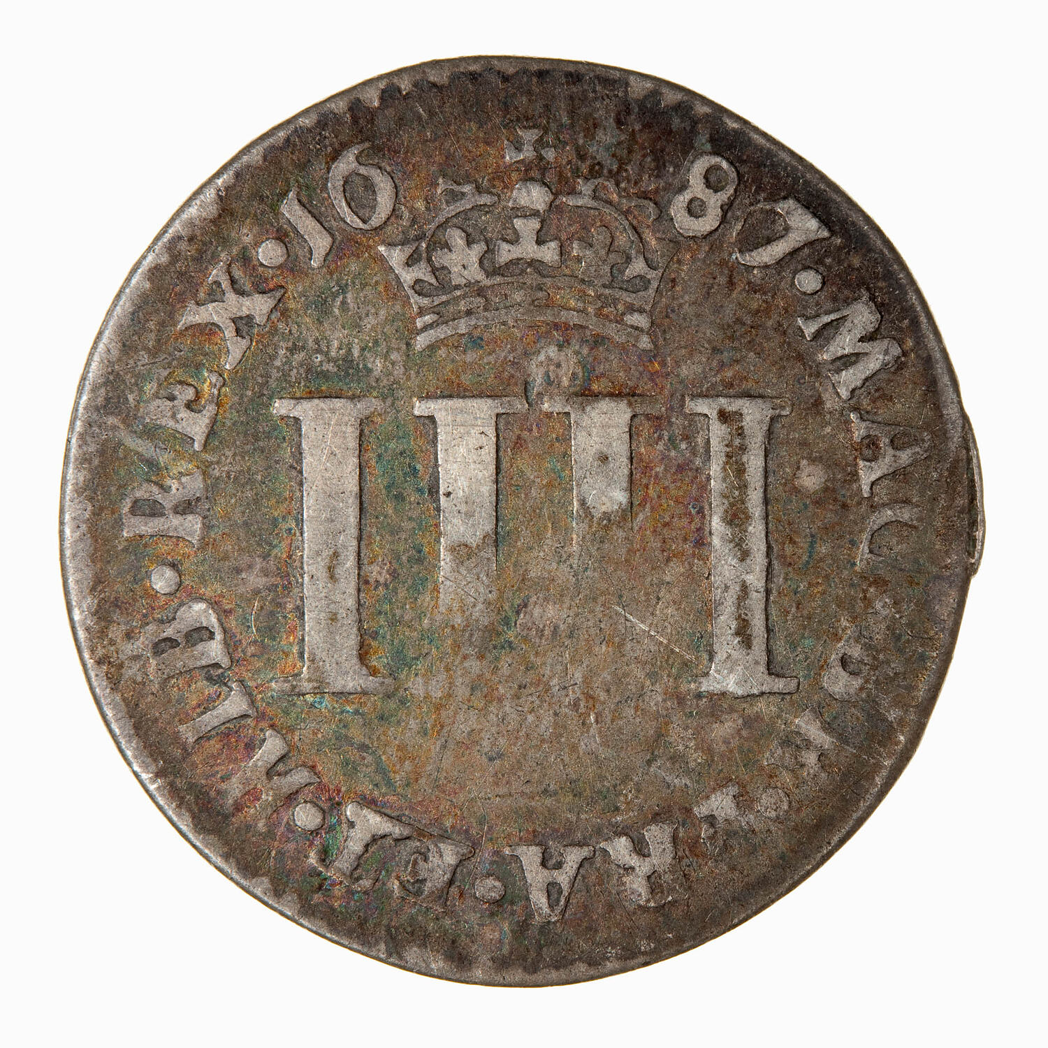 At centre the Roman numeral IIII; above, dividing the date, a crown; around, MAG BR FRA ET HIB REX 1687