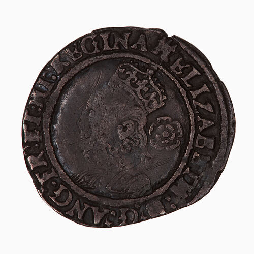 Crowned bust of the queen facing left in ruff and embroided dress; behind, rose; around, (mm castle) ELIZABETH D G ANG FR ET HI REGINA