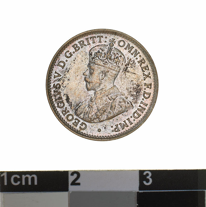 A silver coin (16 mm diameter with plain edge) featuring a crowned and robed bust of George V facing left; around, GEORGIVS V D.G. BRITT: OMN: REX F.D. IND: IMP: ; below bust in small lettering the artist's initials B.M.. The reverse features the Ensigns Armorial of the Commonwealth of Australia, as authorised by Royal Warrent 7th May 1908 - composed of a simple shield enclosing a cross of Saint George on which are five six-pointed stars, around the outside of which are six small escutcheons, i.e., small shields. The shield is supported by a kangaroo and an emu standing on a grassy mound. Above the shield a crest, the seven-pointed star of Federation on a wreath. Below on a ribbon the motto ADVANCE AUSTRALIA is inscribed. Around above, THREEPENCE and below, between arrow heads, the date, 1936.