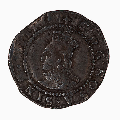 Crowned bust of the queen facing left in ruff and embroided dress; behind, 2 pellets; around, (mm cross) E D G ROSA SINE SPINA (translation, Elizabeth by the grace of God, a rose without a thorn)